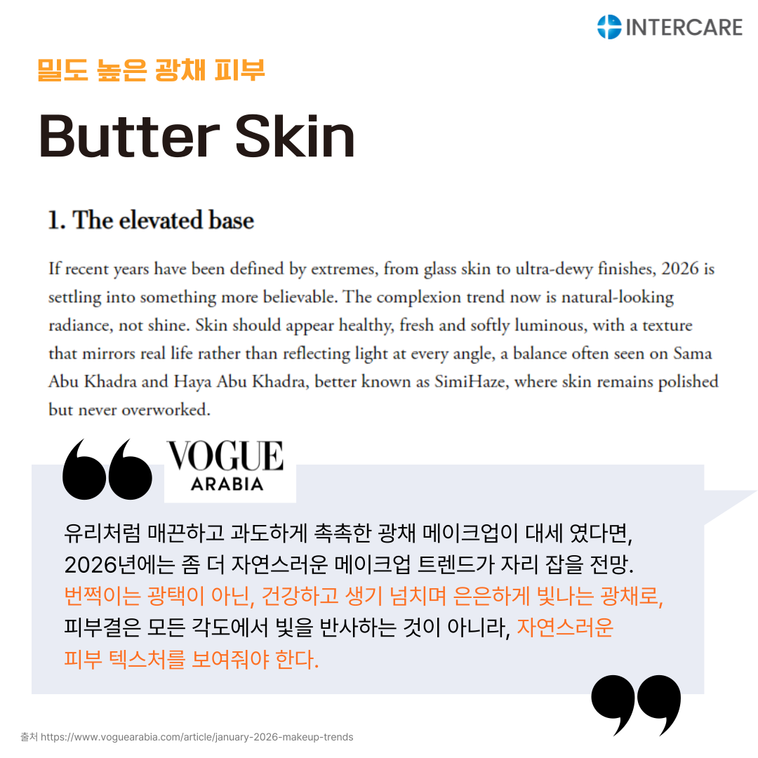 2026년 2월 마켓 트렌드에서는 글로우 스킨케어 흐름 속에서 지속적으로 변주되고 있는 스킨케어 텍스처 중, 매끄럽고 윤기 나며 속이 꽉 찬 듯한 탱탱한 피부 표현인 '버터스킨(Butter Skin)' 트렌드와 인터케어 원료를 함께 소개합니다.