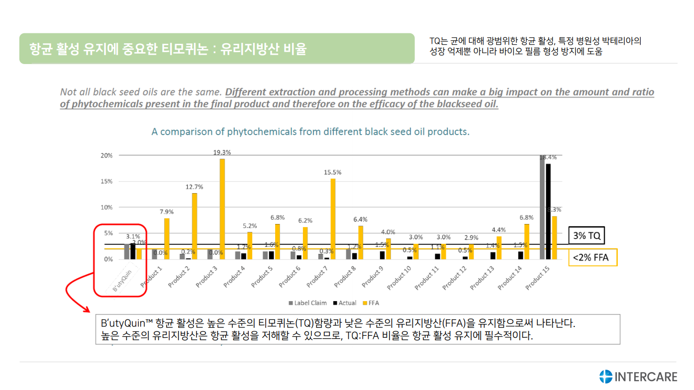 블랙 커민의 핵심 화합물 티모퀴논(Thymoquinone) 3% 함유, FFA 2% 이하로 품질 spec 게런티