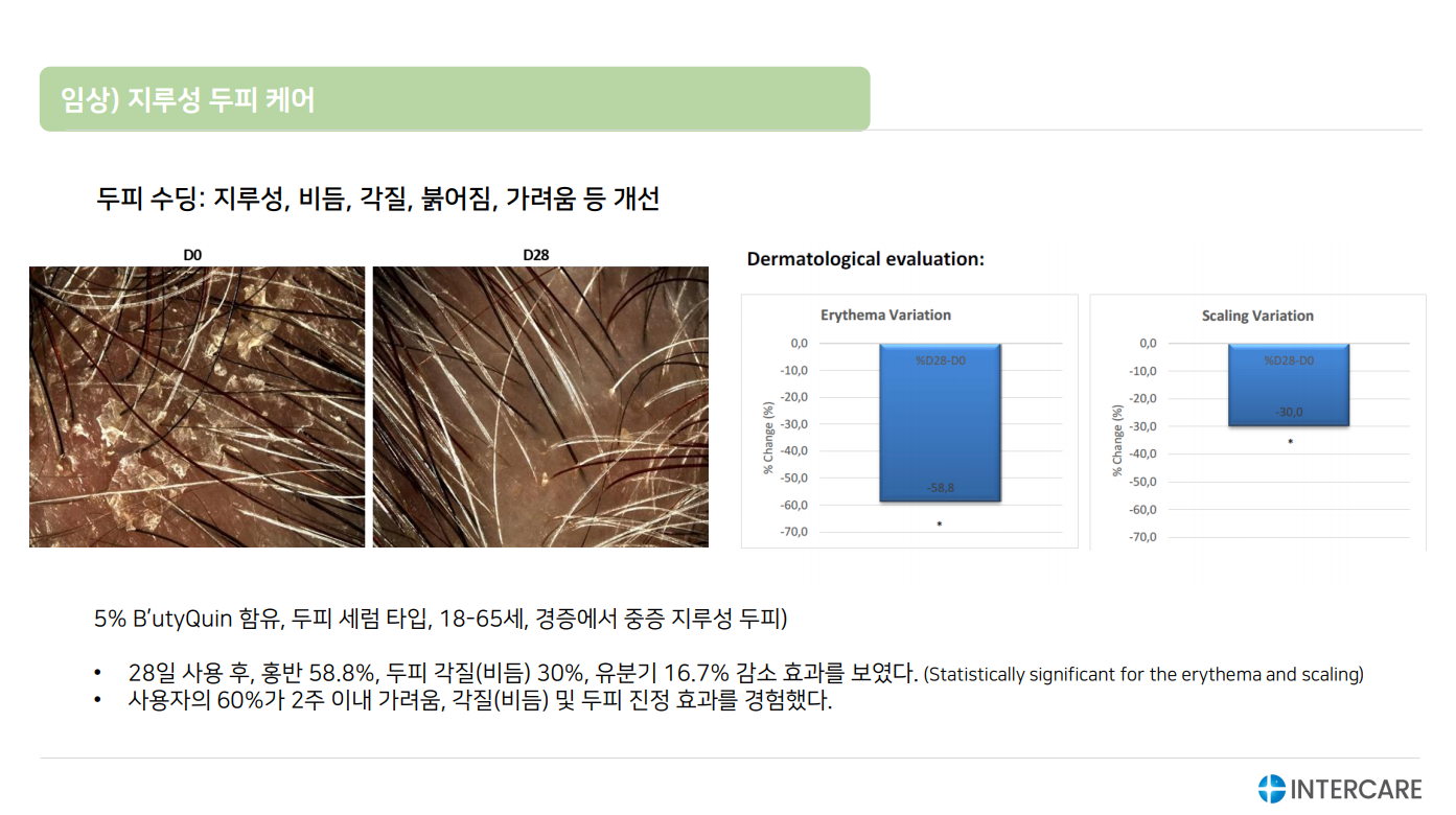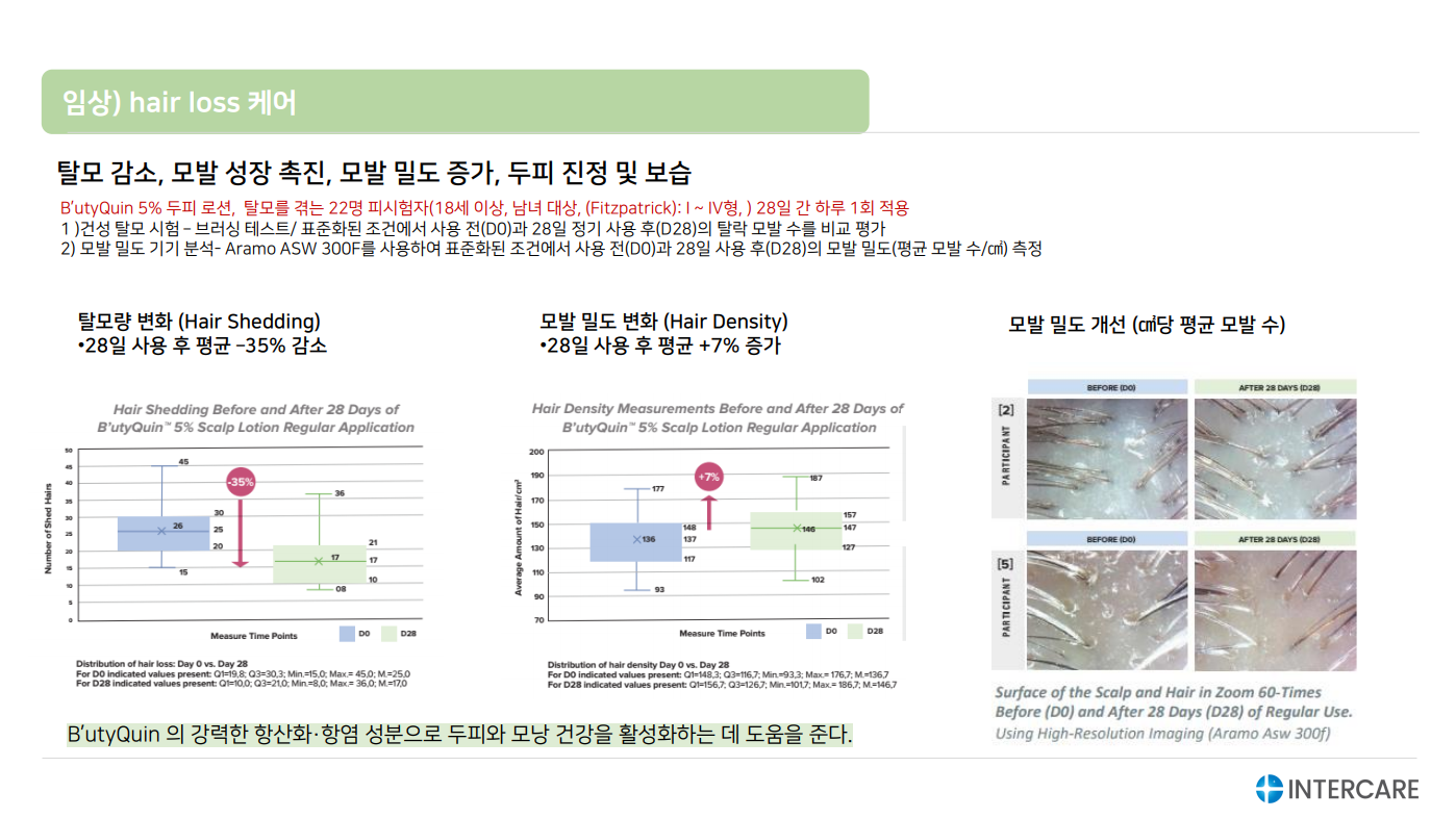 임상: 두피 세럼 (5% 적용): 28일 후 비듬, 가려움, 붉은기 완화 / 항노화 크림 (3% 적용): 탄력, 보습, 광채 개선 / 두피 로션 (5% 적용): hair loss 개선, 모발 밀도 향상 및 두피 건강 개선