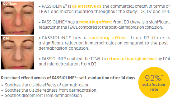 (임상) 1% 적용, 피부 박피 후 유명 재생크림(액티브 다량 함유)과 Passioline의 효과 비교(피부 복구, 진정, 보습, 염증 등)