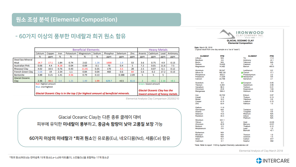 60가지 이상의 풍부한 미네랄과 희귀 원소 함유: 피부에 유익한 미네랄이 풍부하고, 중금속 함량이 낮음